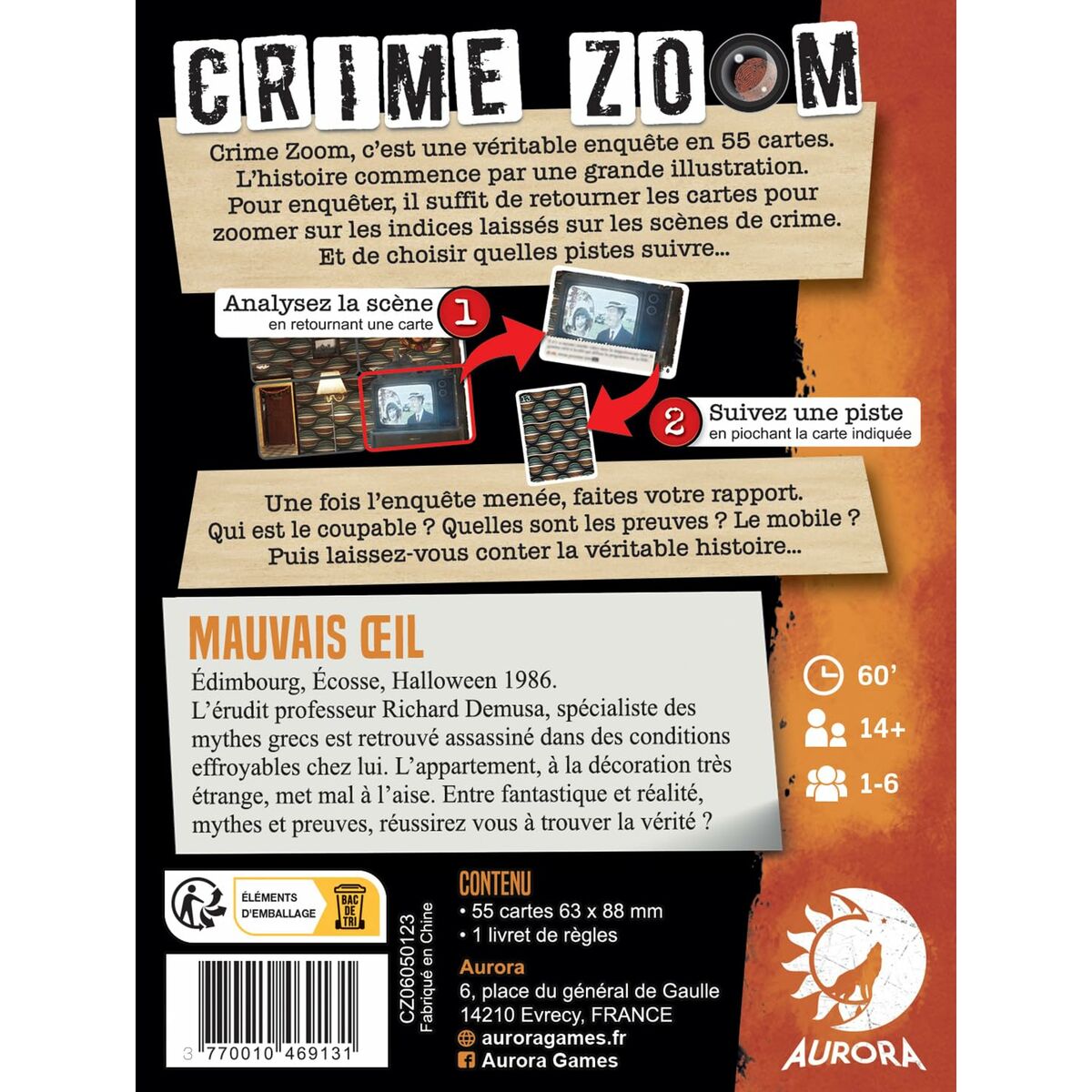 El Crime Zoom: Evil Eye de Asmodee es un juego de mesa de investigación especialmente diseñado para jugadores a partir de 14 años, que ofrece una experiencia de juego auténtica y dinámica en un formato compacto. Fabricado con material de cartón de alta calidad, este juego está concebido para que entre 1 y 6 participantes se sumerjan en un caso criminal detallado que desafía la lógica y la percepción, ideal para sesiones de juego que oscilan entre 30 minutos y 1 hora. La mecánica de investigación y resolución de enigmas se despliega de manera clara y atractiva, con instrucciones en francés, lo que lo convierte en una opción precisa para quienes dominan este idioma y buscan una experiencia lúdica profunda y original en este mercado lingüístico. Su diseño gráfico y componentes están orientados a facilitar la inmersión en la trama, promoviendo la colaboración o la competición entre jugadores según las reglas establecidas, lo que añade valor a la interacción social y al entretenimiento intelectual. La combinación de sus características lo posiciona como un recurso lúdico adecuado para grupos familiares o de amigos que disfruten de retos mentales y juegos de mesa con una historia envolvente y bien estructurada. En definitiva, Crime Zoom: Evil Eye representa una propuesta sólida y cuidada dentro del segmento de juegos de mesa de investigación, aportando un equilibrio entre dinamismo, estrategia y accesibilidad.