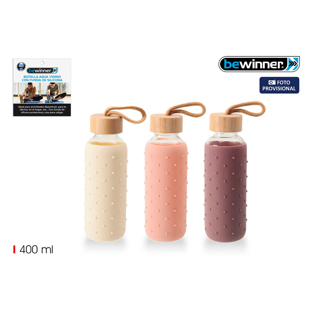 Botella de Agua Bewinner Vidrio Silicona 400 ml 7 x 7 x 19,8 cm (24 Unidades)